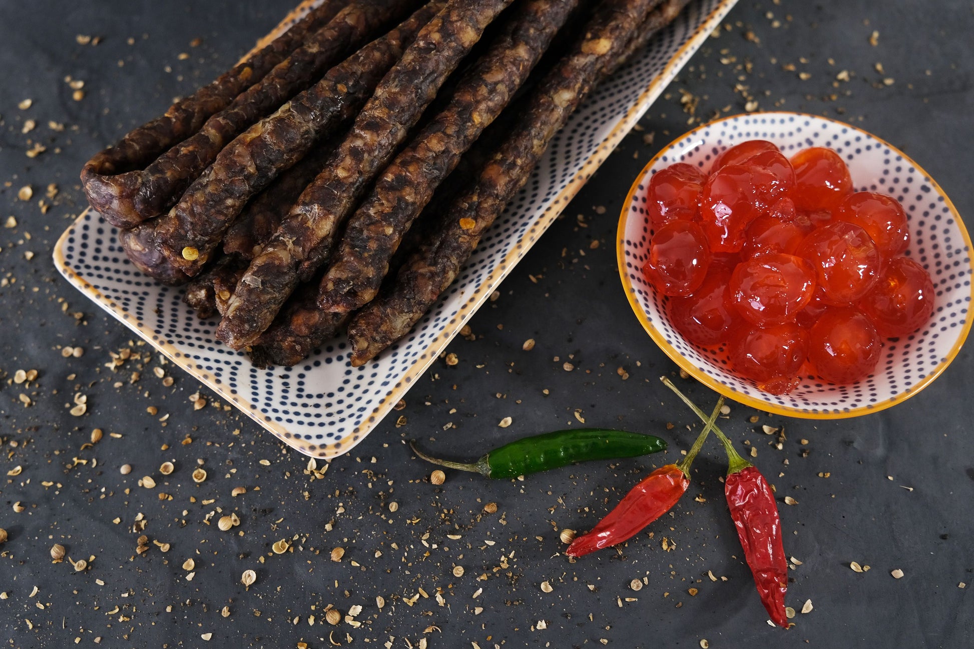 Free Range Dry Wors with Oxtail Fat, Mild chilli spice and real glazed cherries.